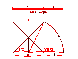 Il a donné les propriétés des pentagones et des décagones réguliers. Nous trouvons déjà dans son œuvre une théorie des proportions et en particulier le partage d'un segment en moyenne et extrême raison. Cela signifie que l'on cherche le point du segment tel que: la longueur totale a+b rapportée à la longueur du grand segment a est dans la même proportion que celle du grand segment a par rapport au petit segment b. Ce segment est partagé suivant la section d'or ou la proportion divine Les rapports (a+b)/a et a/b étant égaux, de l'équation a / b = ( a + b ) / a on ontient l'équation ( a / b )² - a / b - 1 = 0