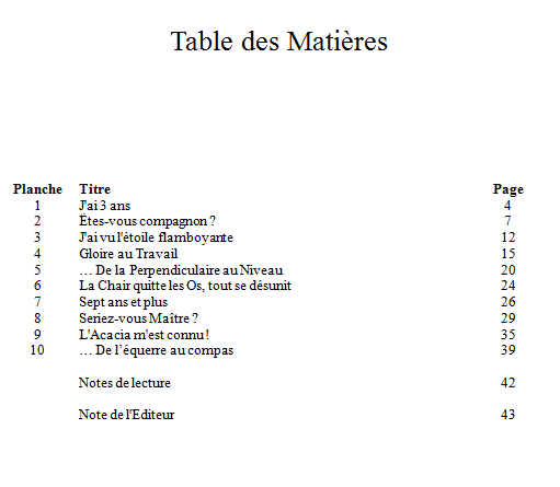 Cinq ans, Sept ans et plus. Etes-vous C, J’ai vu l’Etoile F, De la Perpendiculaire au niveau, Gloire au Travail, Seriez-vous M, l’Acacia est’il connu, Passé de l’Equerre au compas, La chair quitte les Os… |