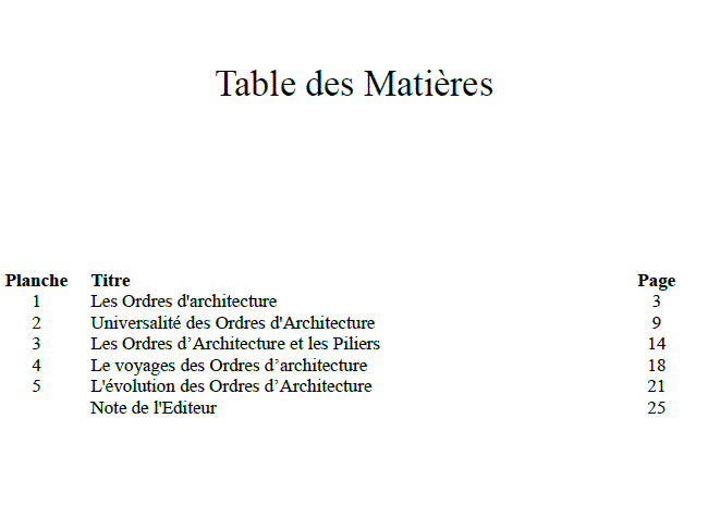 | Tous les Ordres d'Architecture sont traités dans ce Recueil. Leur universalité ainsi que leurs évolutions. Le voyage qui leur est consacré est bien détaillé. |